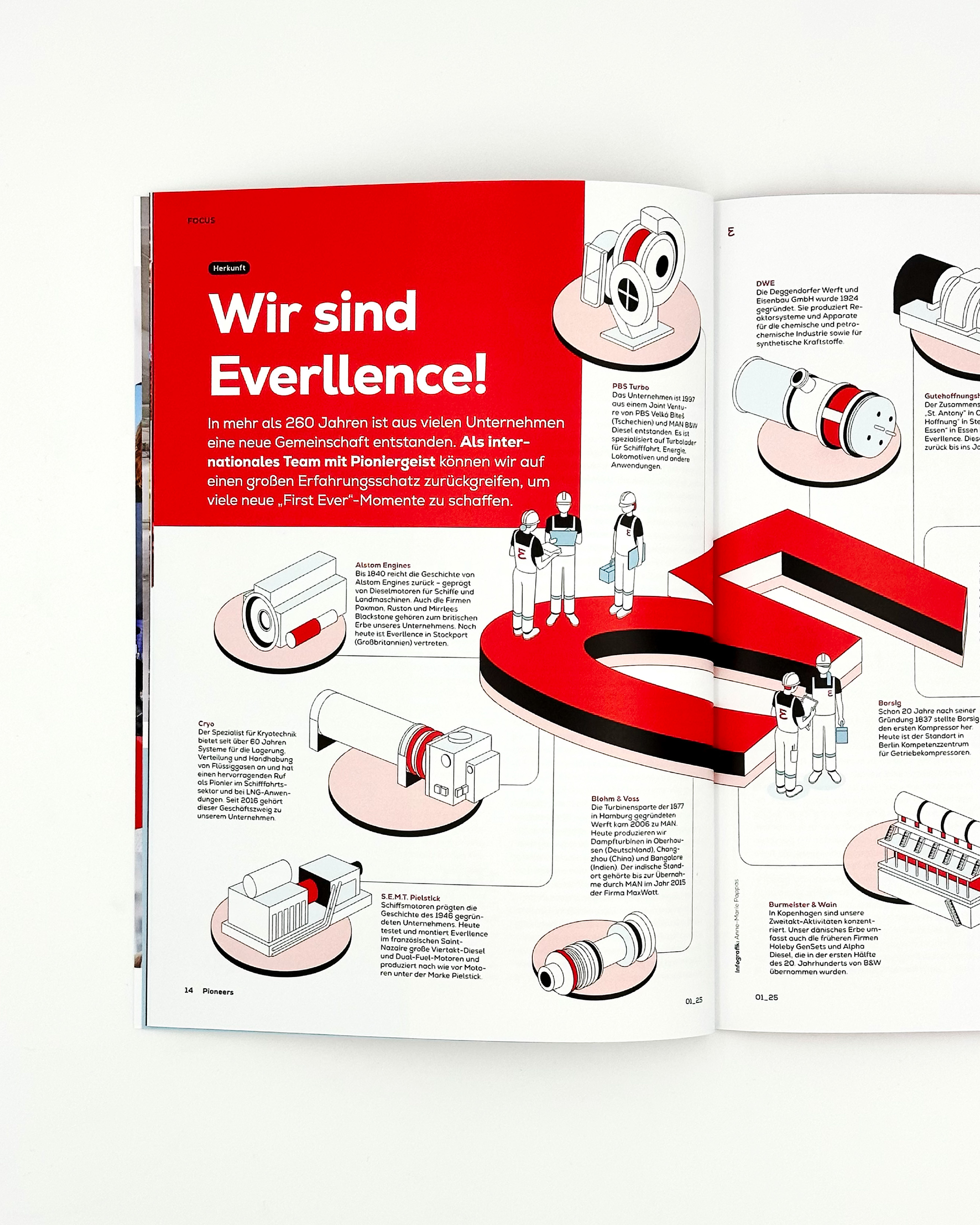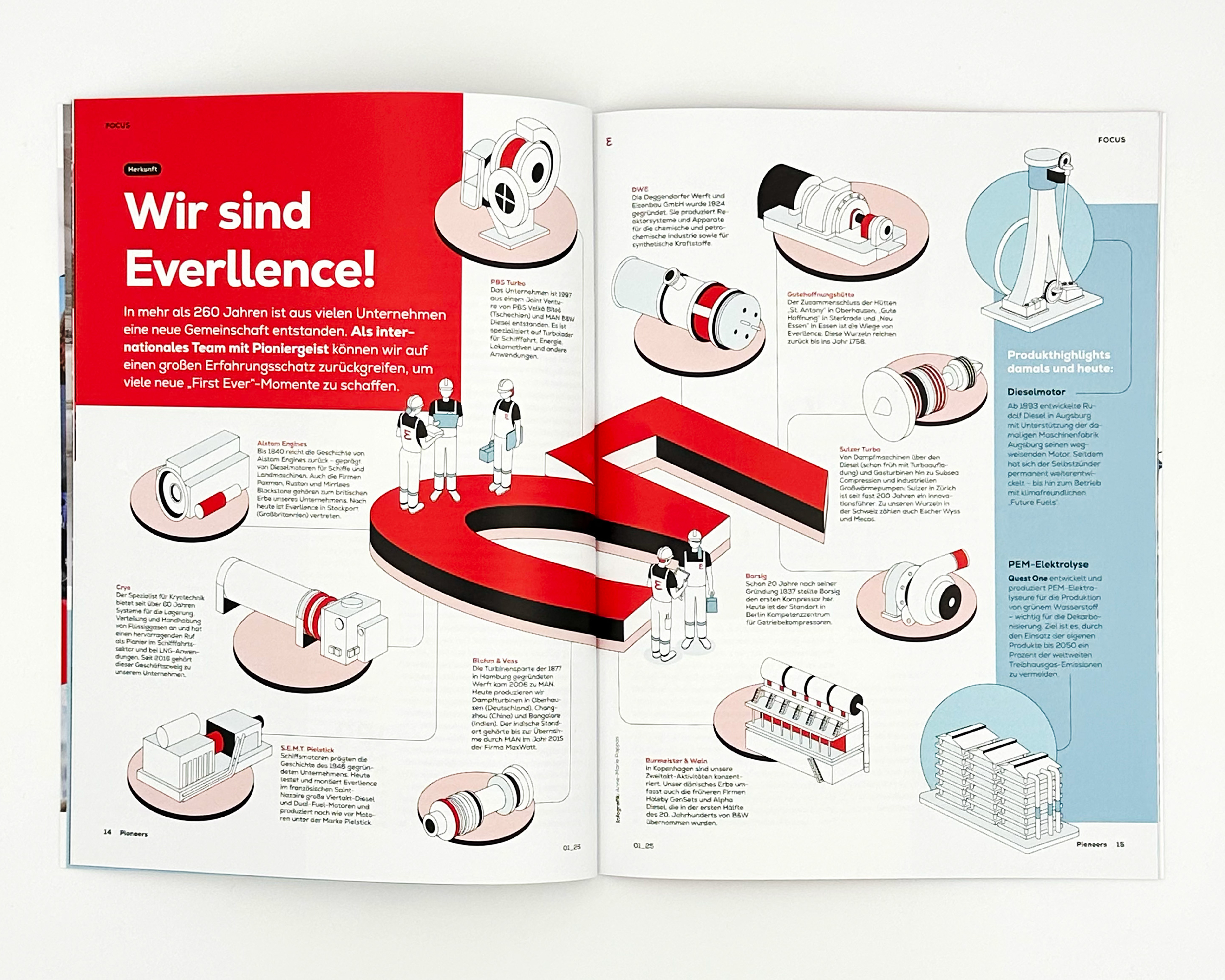 Work created for Axel Springer. A series of illustrations for an infographic in "Pioneers", the magazine of Everllence, developed using their corporate illustration style. The infographic highlights more than 260 years of Everllence’s history.