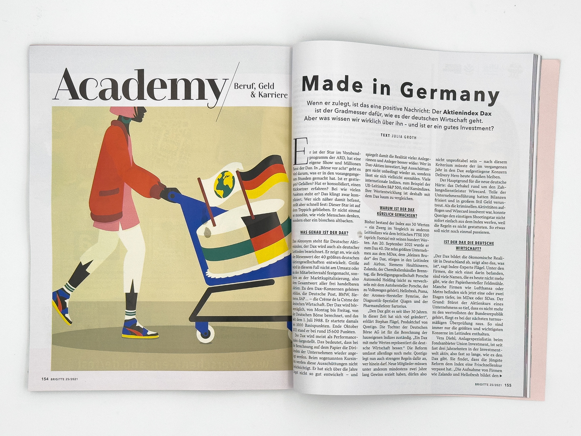 Illustration for the "Career, Money & Jobs" section in issue 25/2021 of Brigitte magazine. The text discusses the DAX stock index, which serves as a key indicator of the health of the German economy.
