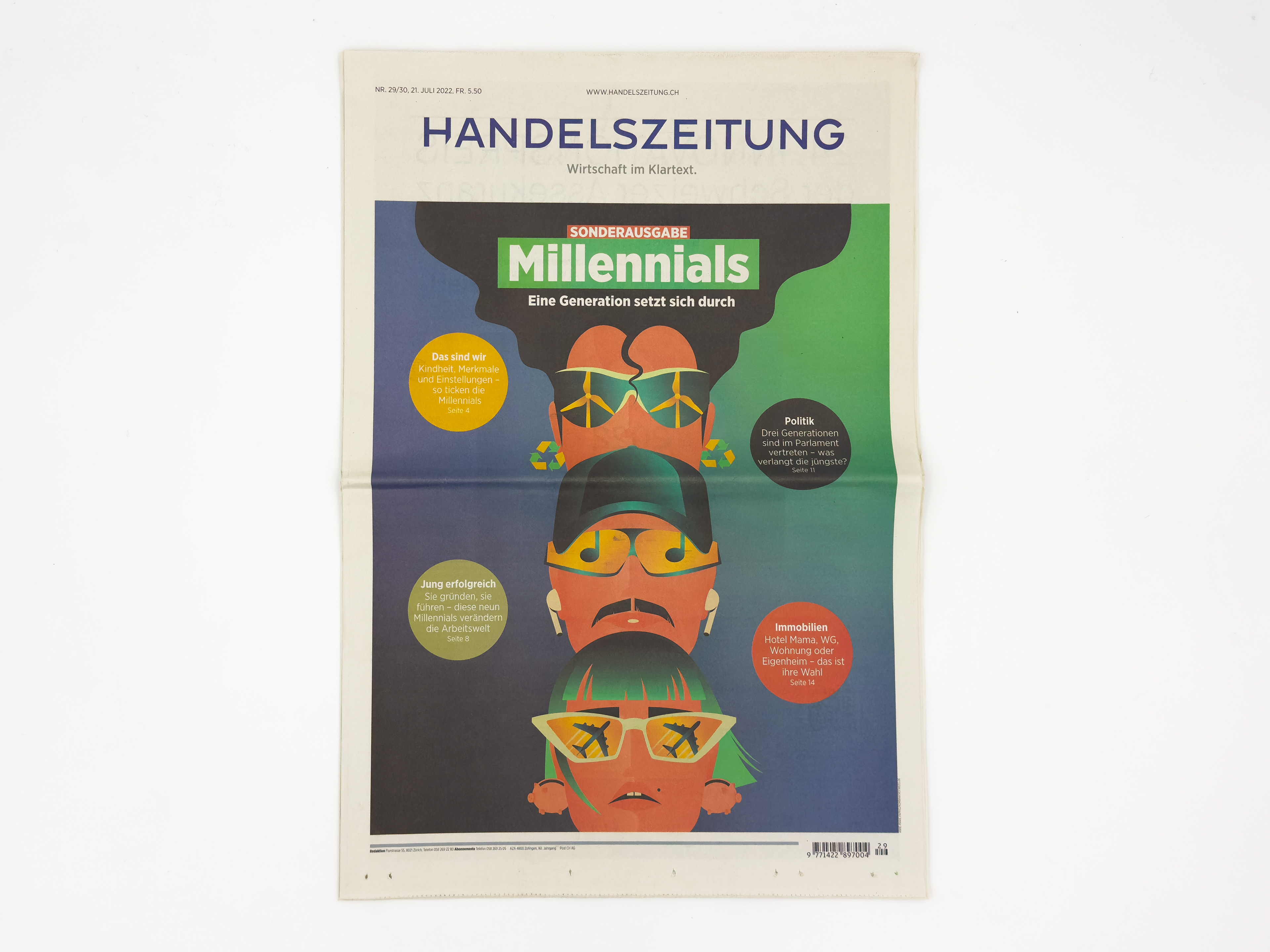 Cover illustration for the Swiss newspaper Handelszeitung. This piece, titled "Millenium: Generation Y am Steuer," delves into the dynamic and influential role of Millennials in today's society and explores their behaviors and attitudes. Read the full articles here.