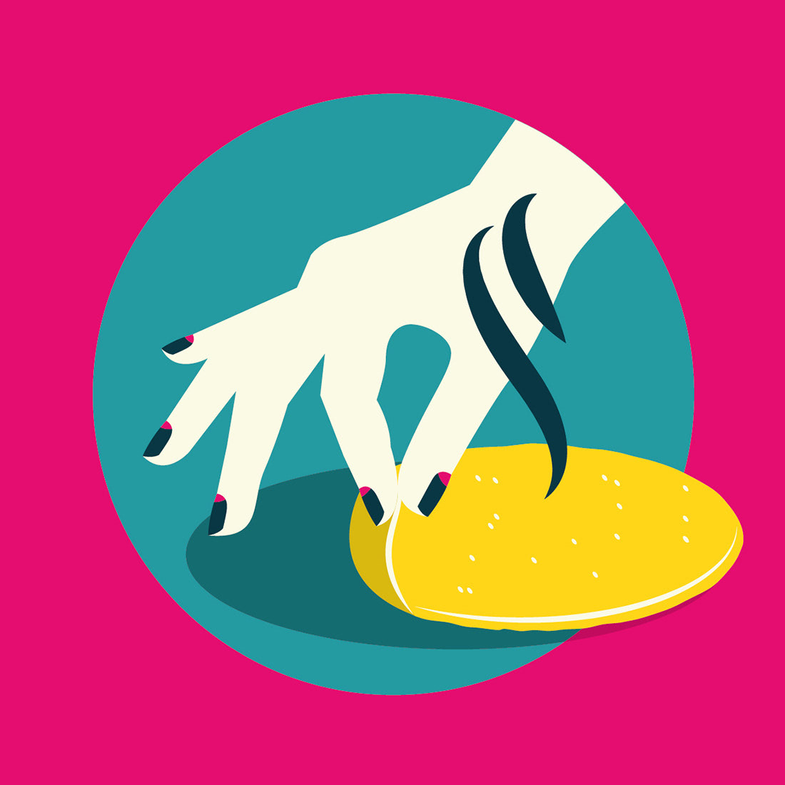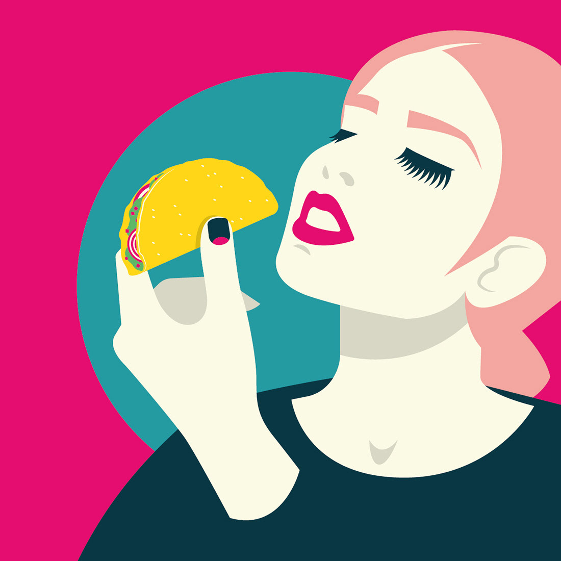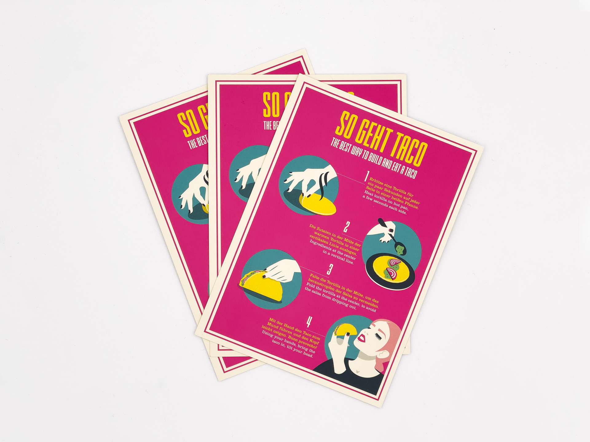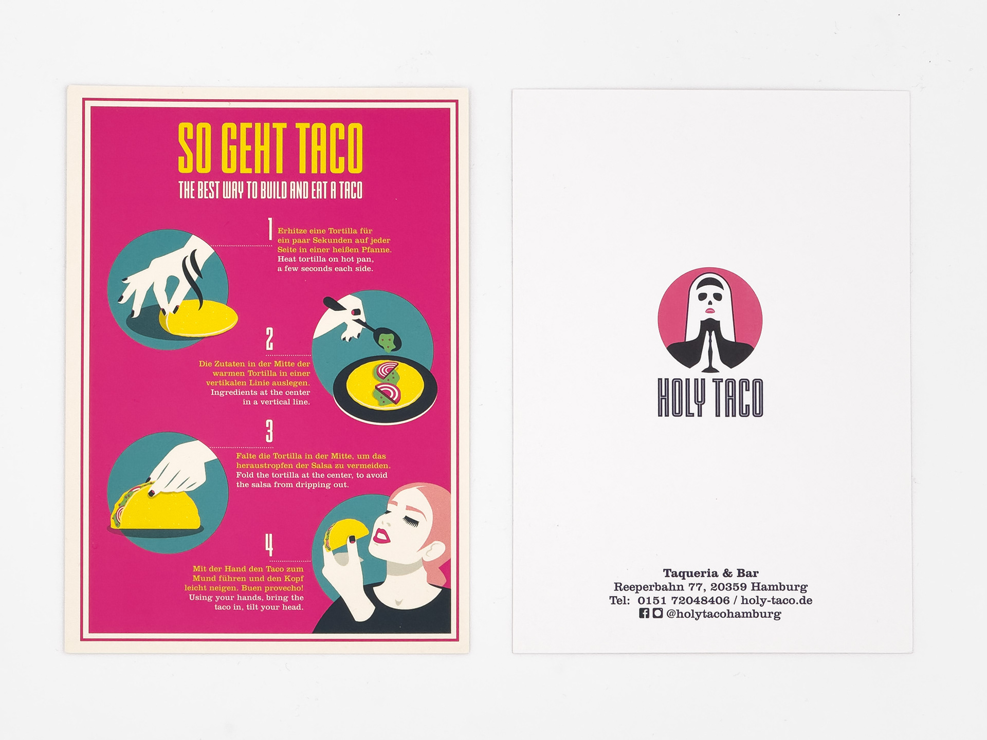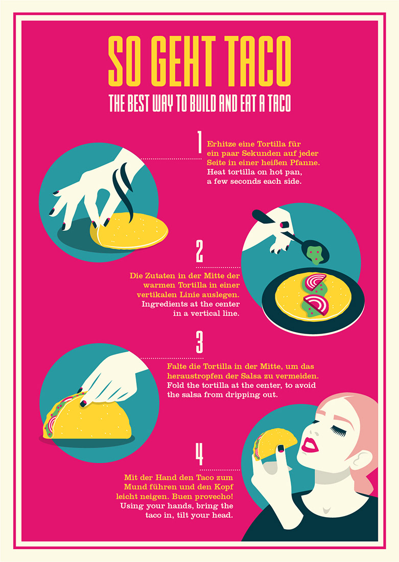 Infographic and design for a flyer for the Mexican restaurant Holy Taco, explaining how to properly eat a taco.