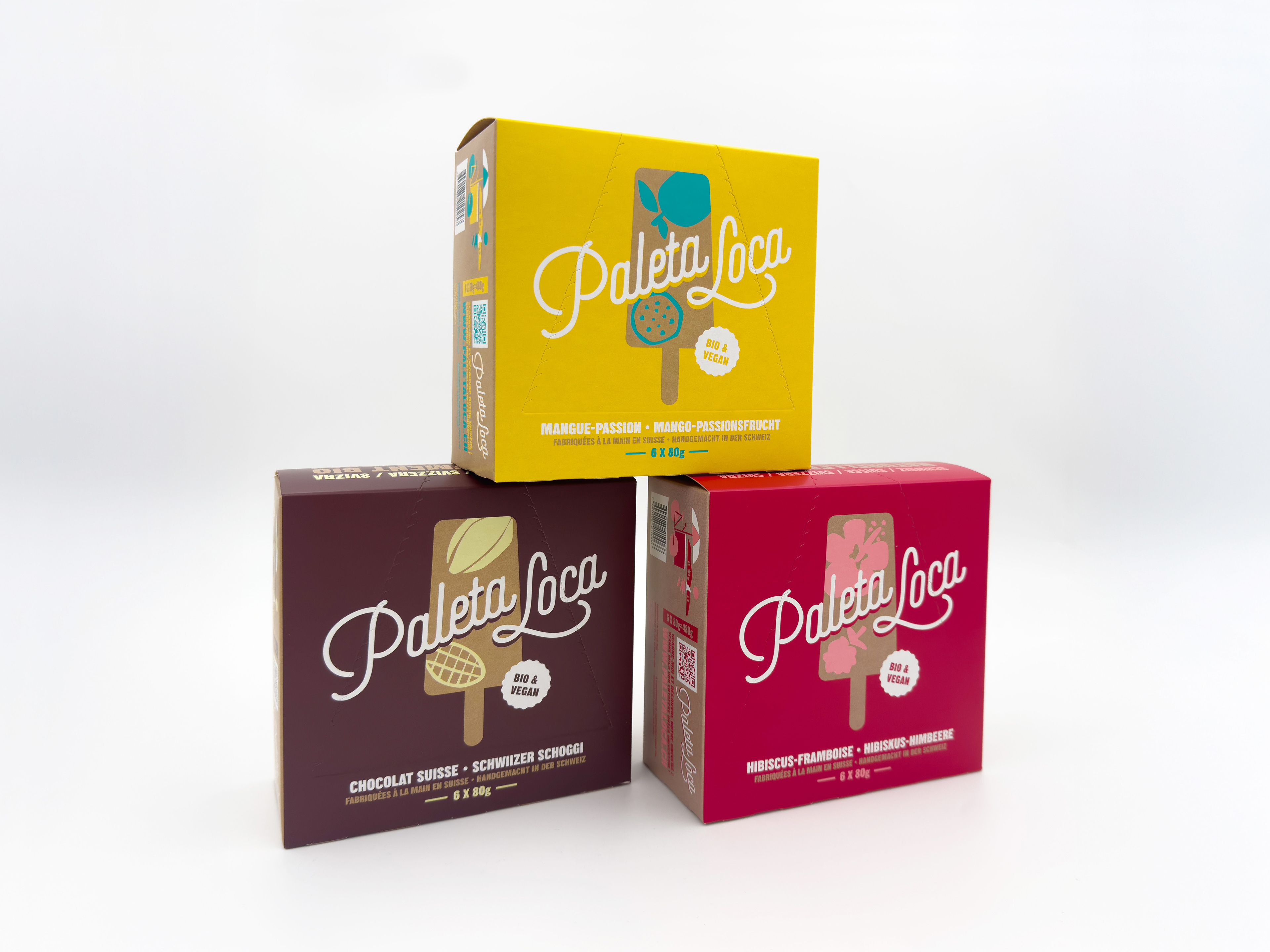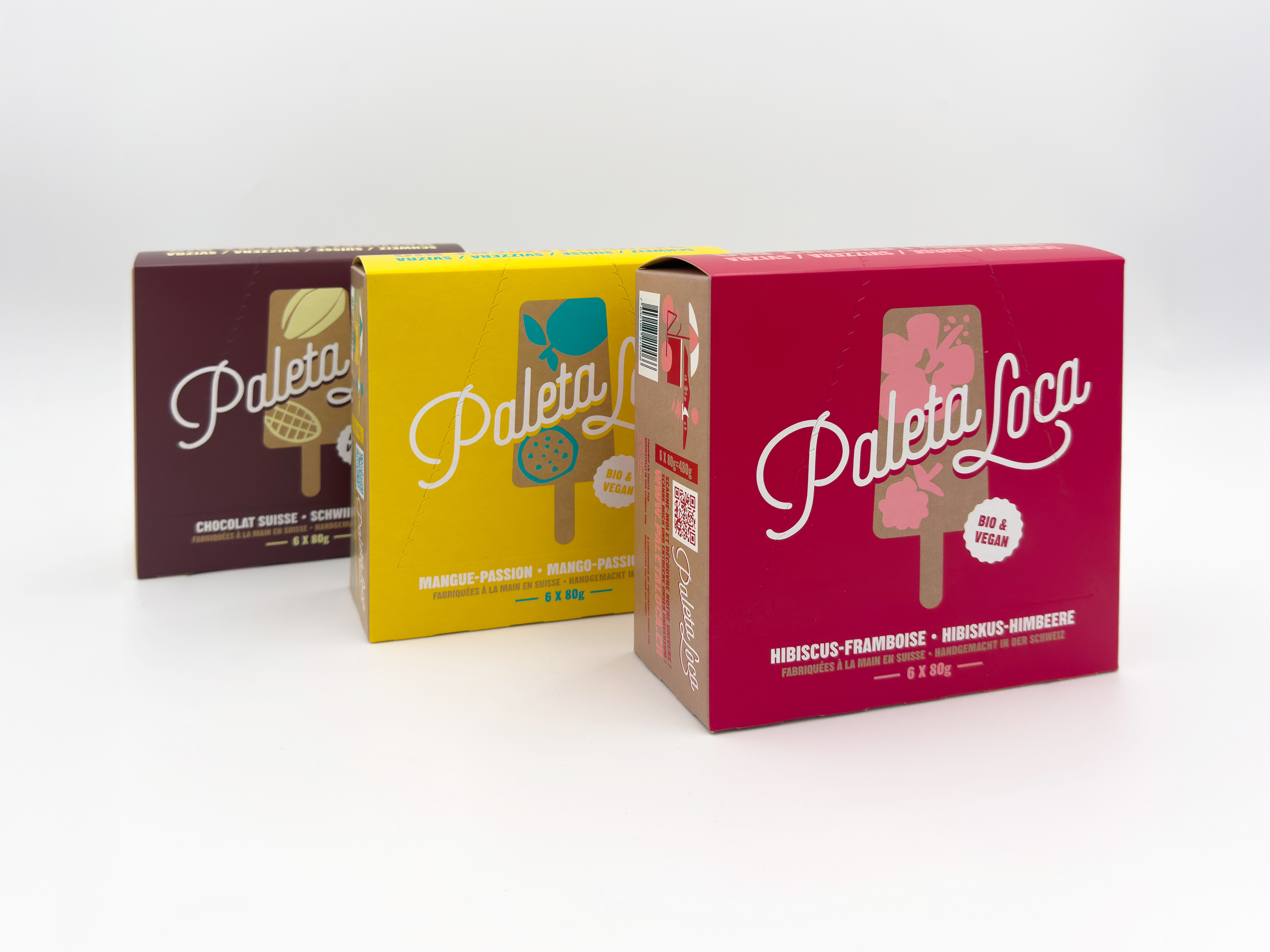 Illustration and packaging design for Paleta Loca, a Swiss paleta brand with 9 unique flavors, featuring a mini comic on the back of each pack telling the brand's story.