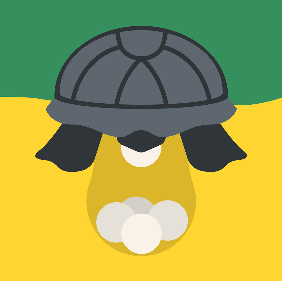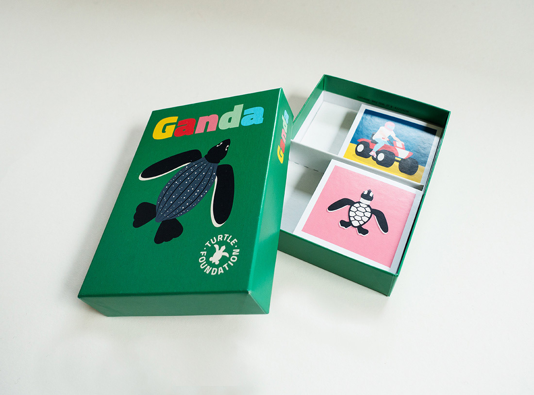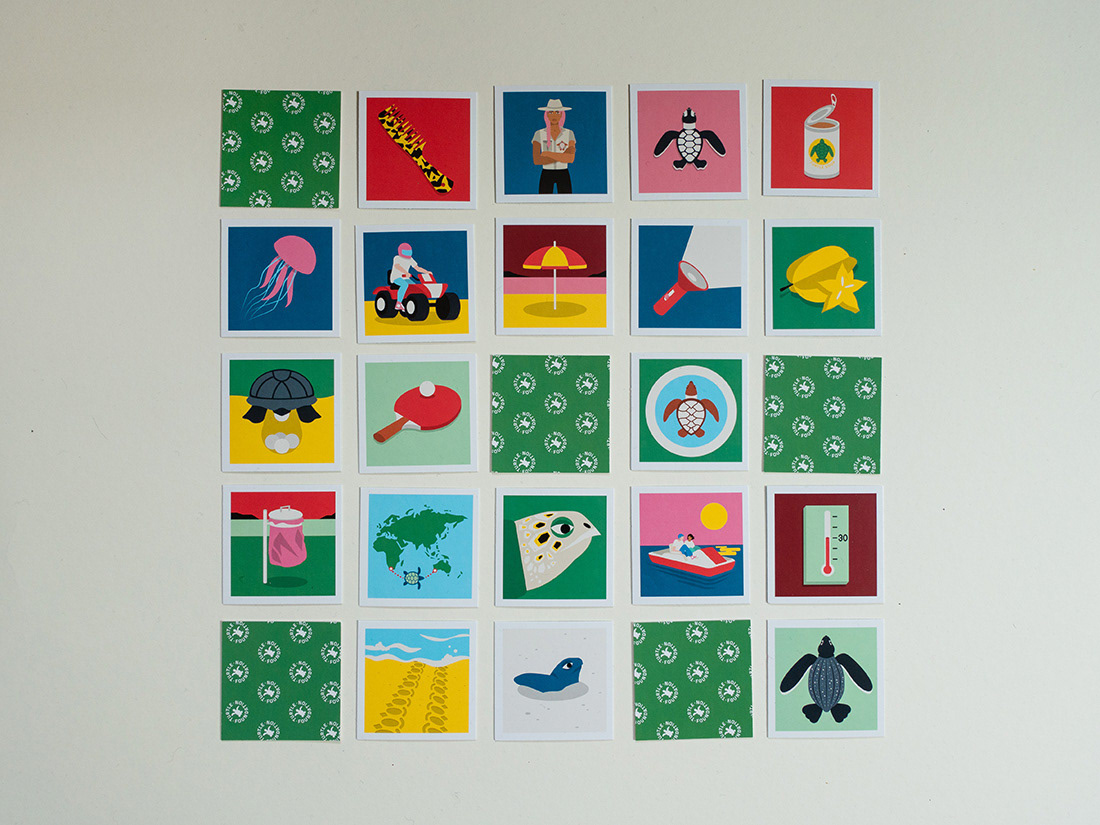 Series of illustrations for the memory game 'Ganda' that shows the different types of sea turtles and the dangers they face on the beaches.