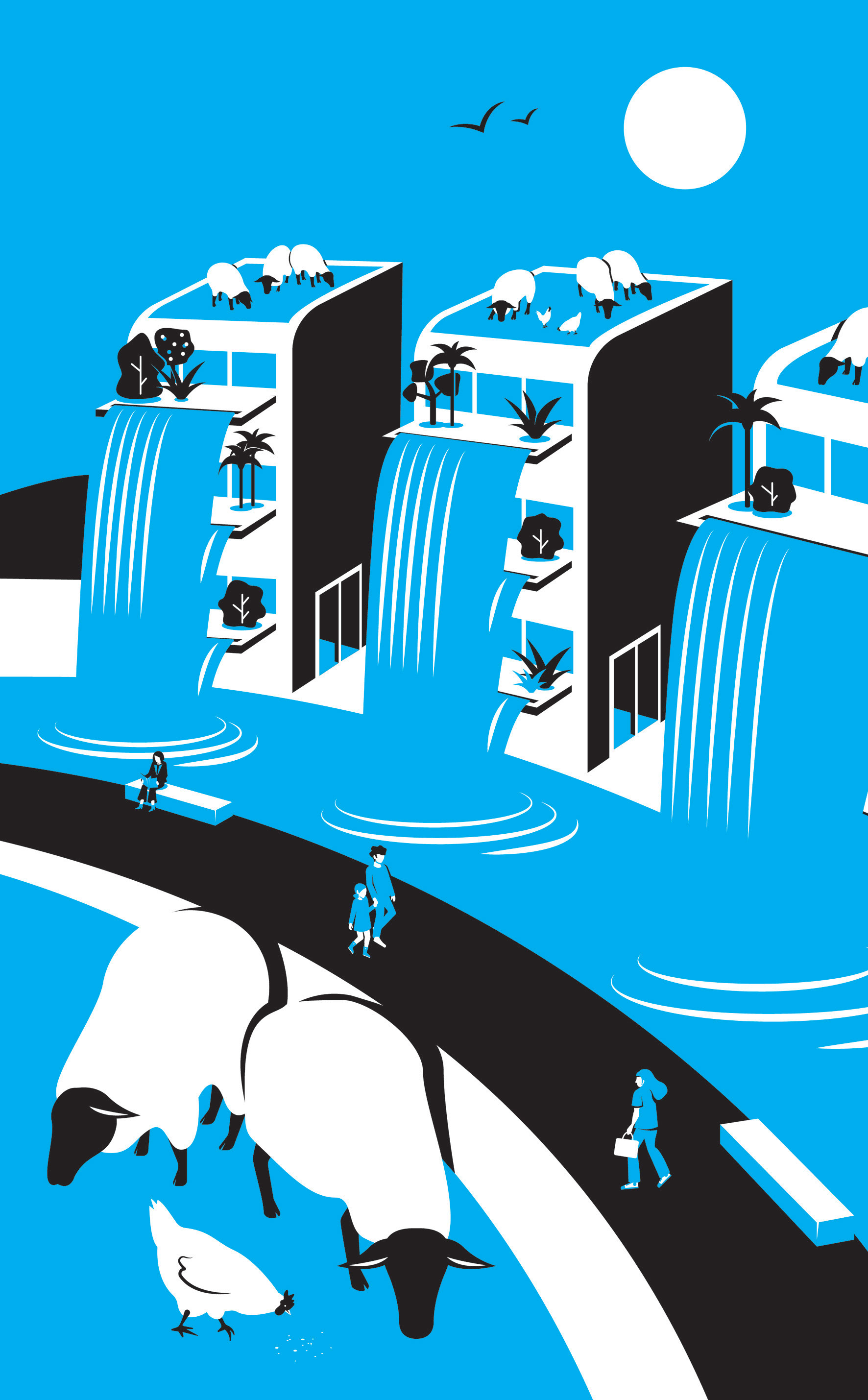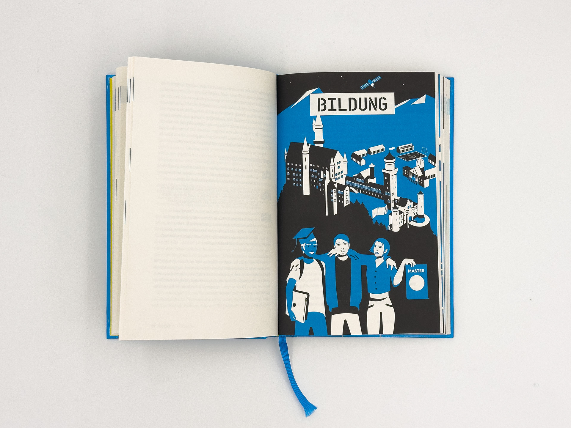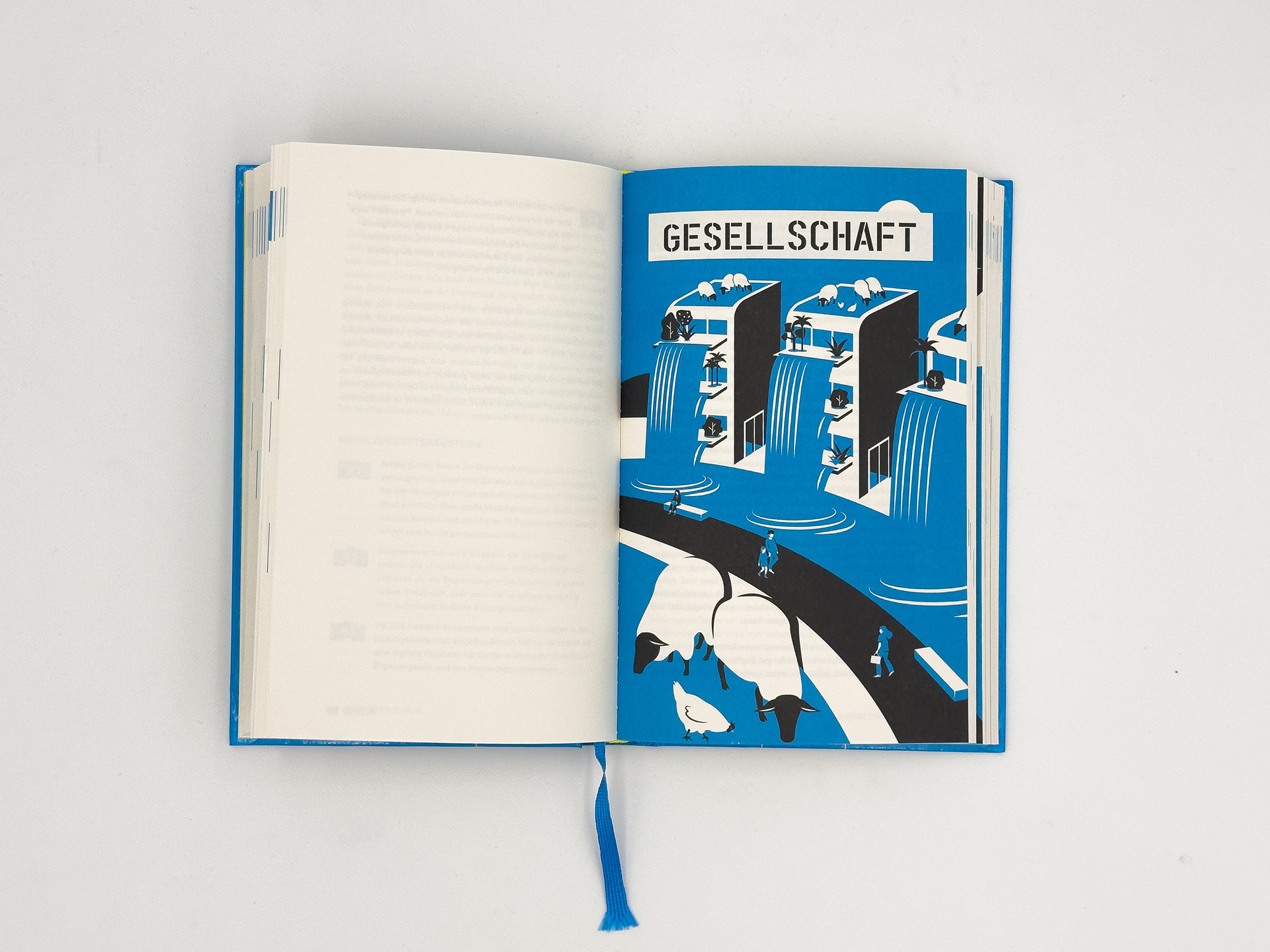 Created a series of six illustrations for Zukunftsrepublik (Campus Verlag), visualizing future-oriented ideas for Germany in 2030. The client’s challenge was to work using only the turquoise from the book cover along with black and white, which shaped the visual style.