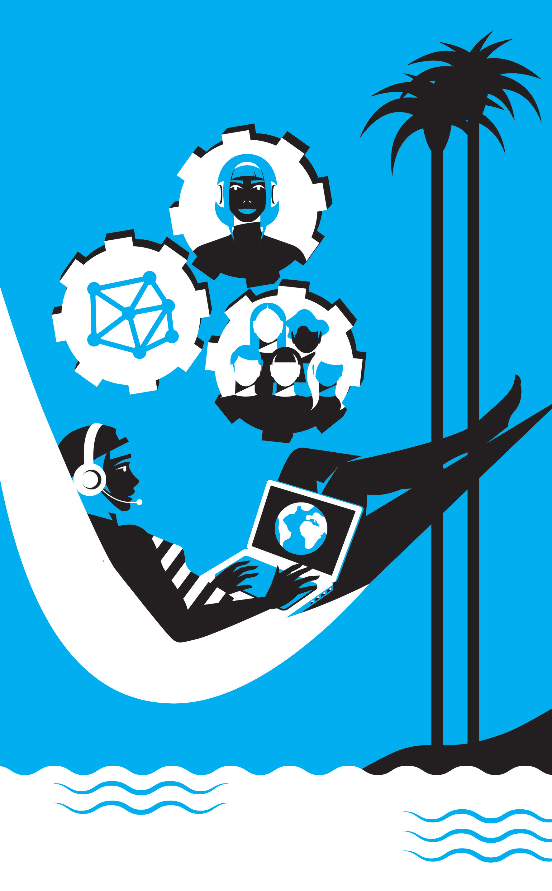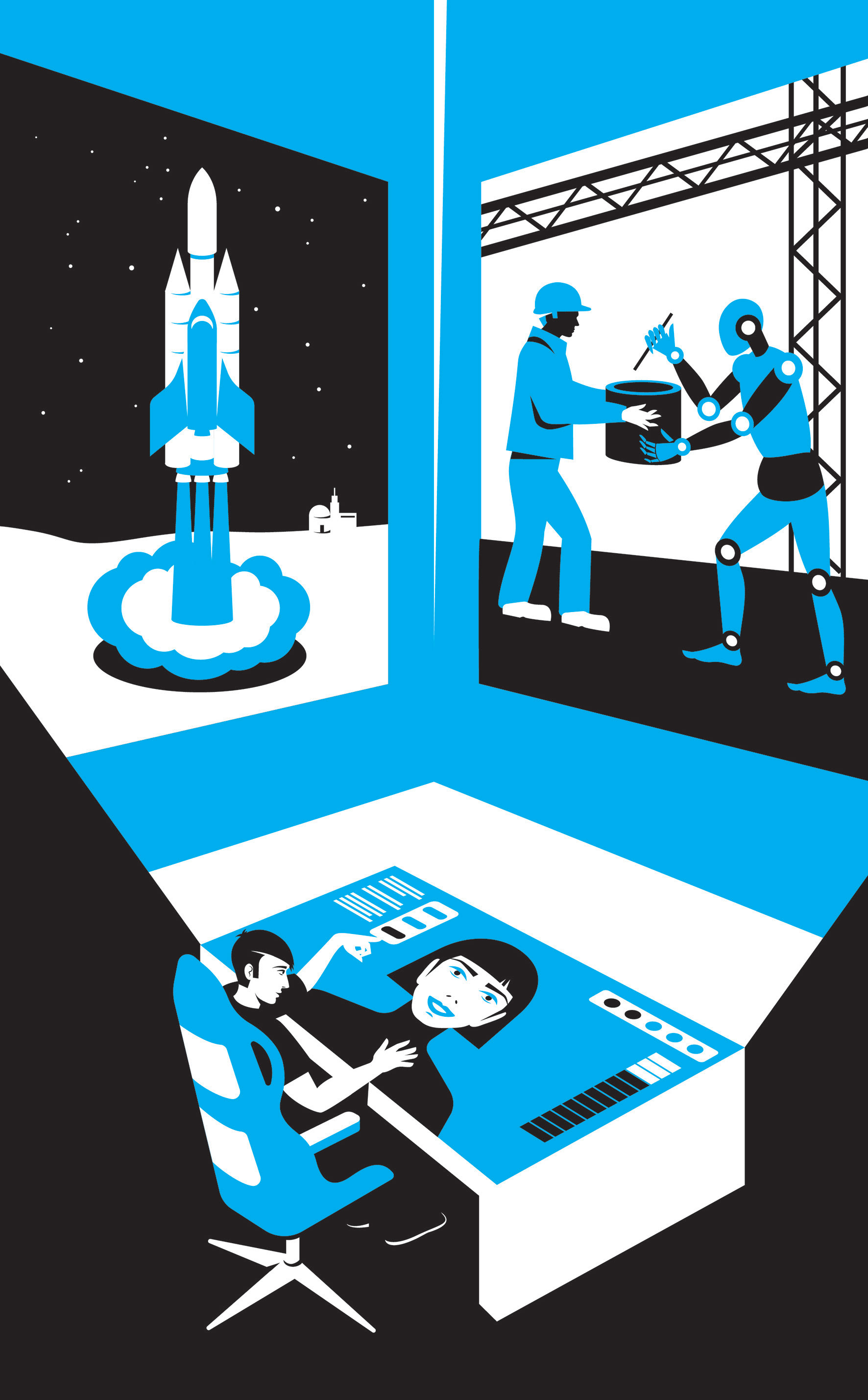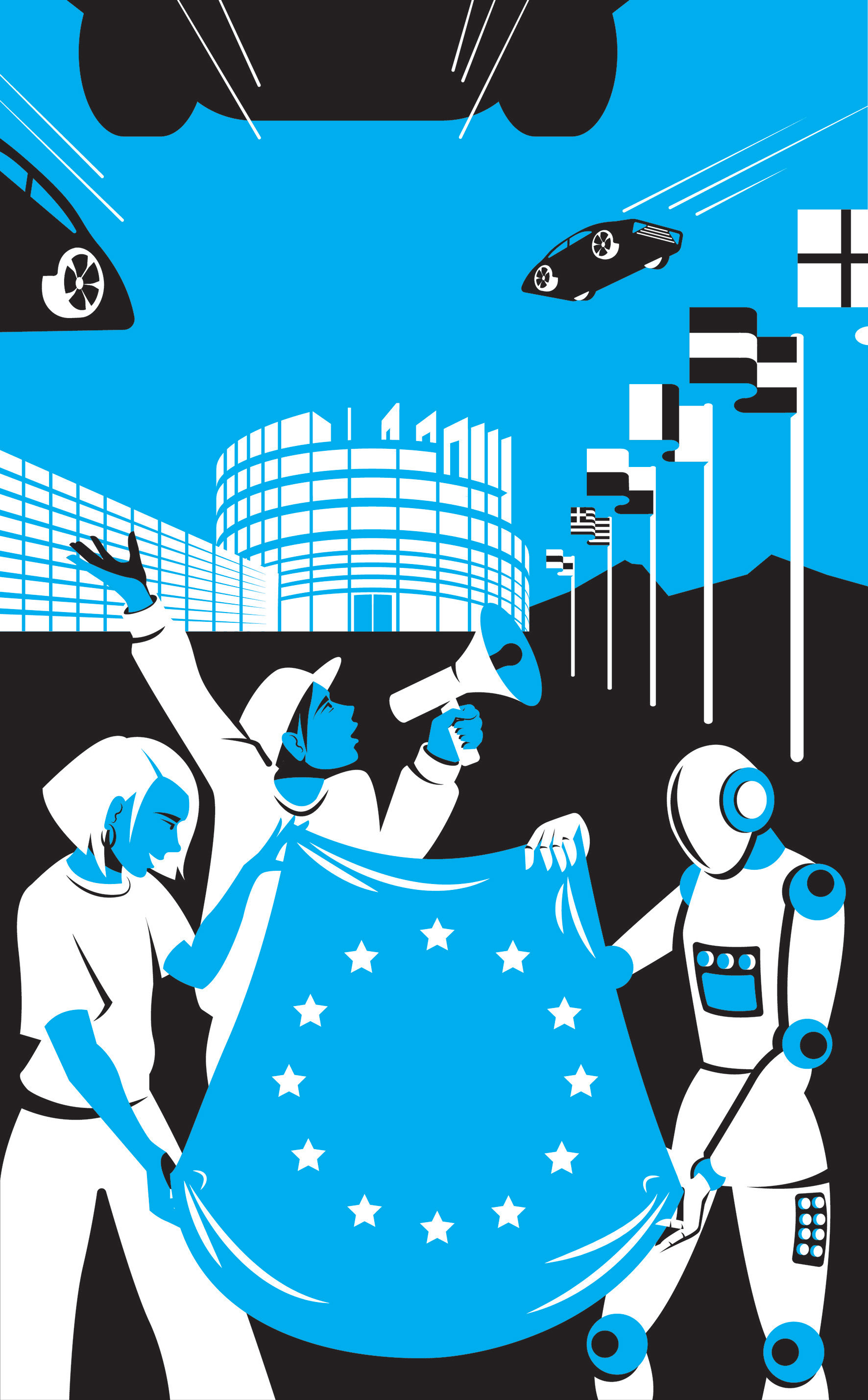 Created a series of six illustrations for Zukunftsrepublik (Campus Verlag), visualizing future-oriented ideas for Germany in 2030. The client’s challenge was to work using only the turquoise from the book cover along with black and white, which shaped the visual style.