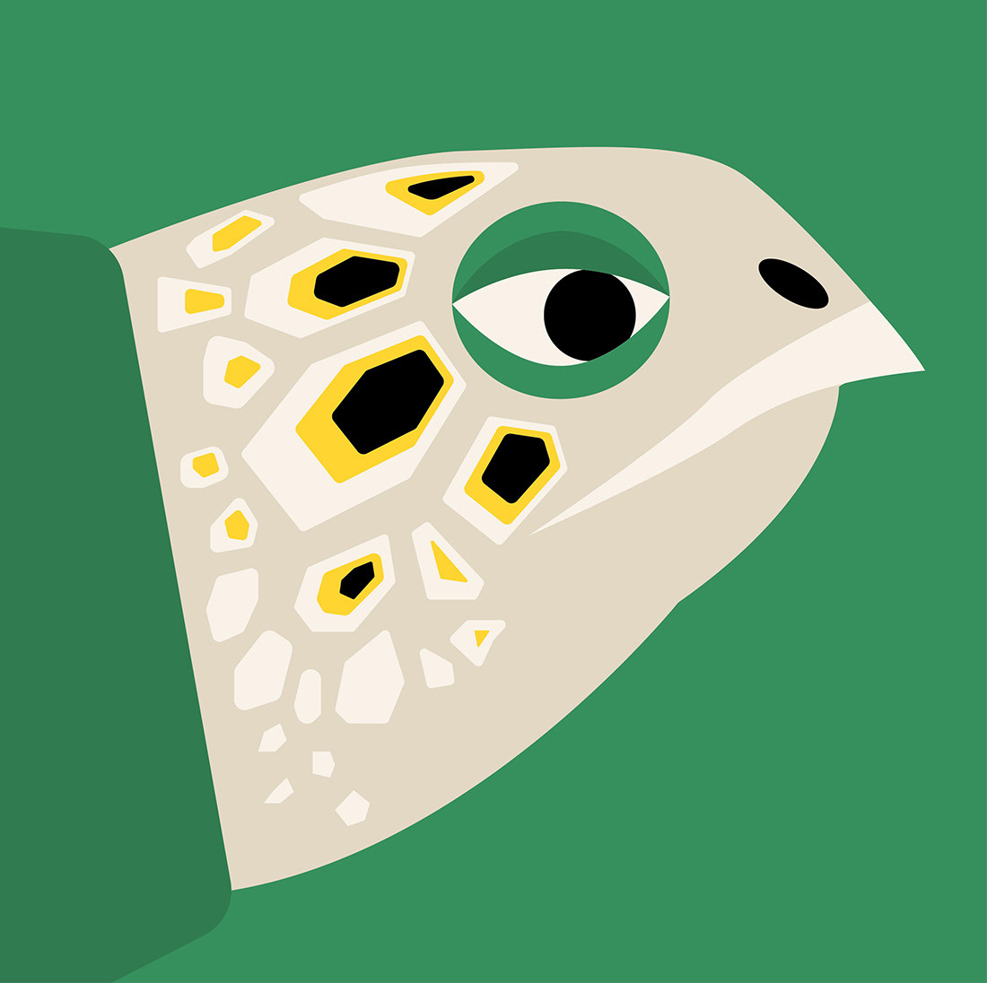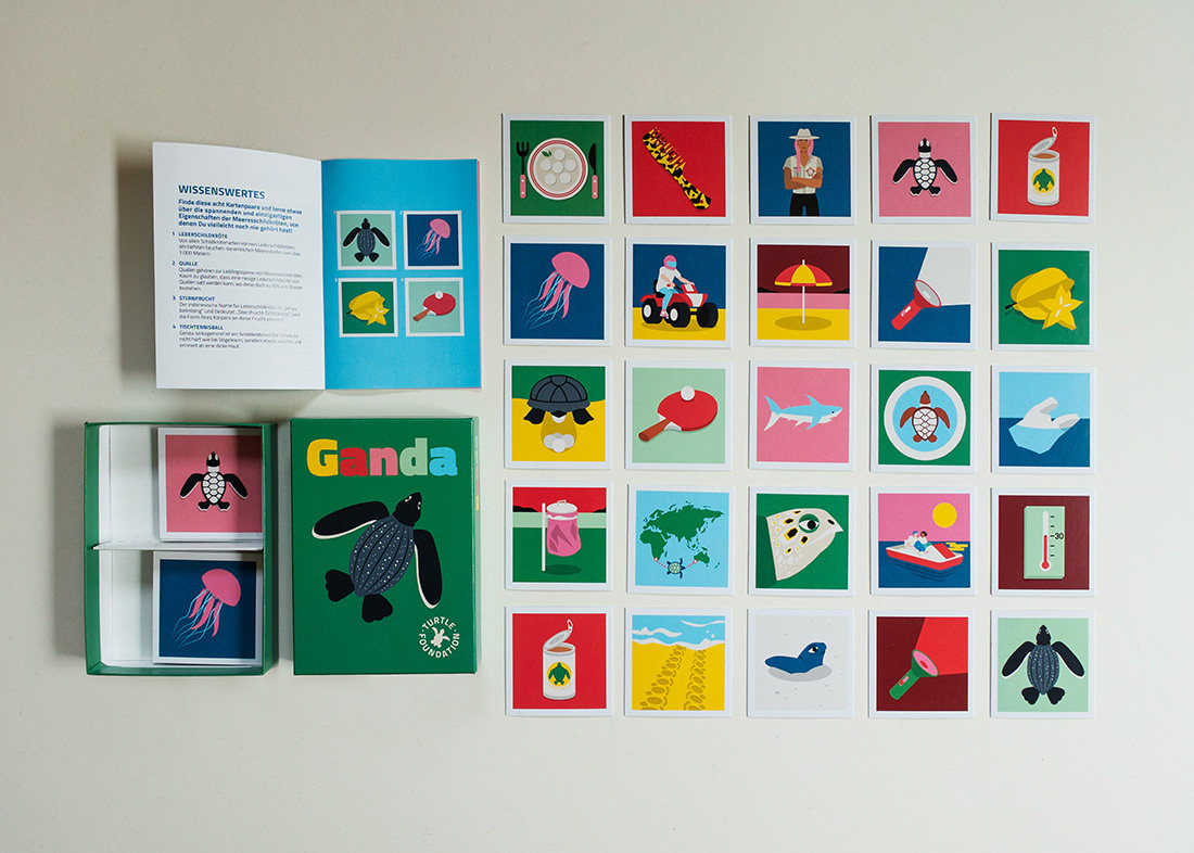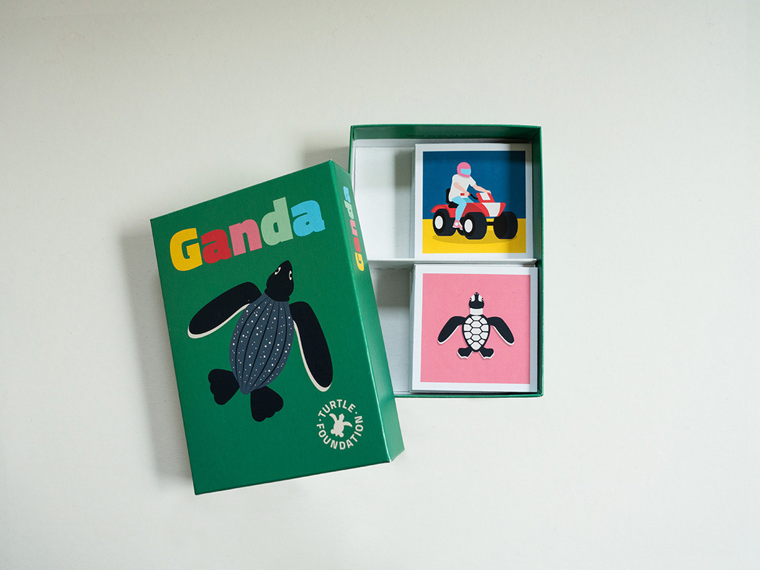 Series of illustrations for the memory game 'Ganda' that shows the different types of sea turtles and the dangers they face on the beaches.